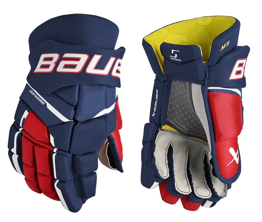 Novinka sezóny 2023/2024. Hokejové rukavice BAUER S23 SUPREME M3 Senior sú určené pre rozvíjajúcich sa hráčov. Nová rada Supreme ponúka nové technológie a materiály, ktoré sú vyvinuté na základe priamej spolupráce so špičkovými hráčmi. Rukavice sú anatomicky tvarované s tesným strihom, ktoré sa dokonalé prispôsobia každému hráčovi, zabezpečuje dokonalú ochranu a neobmedzený pohyb v zápästí.